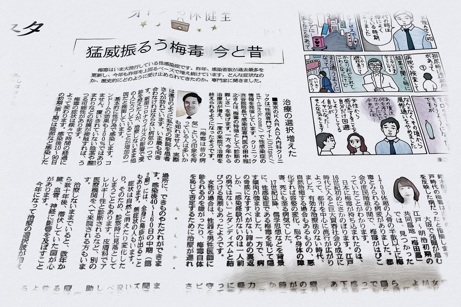 2022年7月20日付朝日新聞夕刊の「オトナの保健室」で「猛威振るう梅毒 今と昔」という記事が掲載された。梅毒の「今」を伝えているのは、東京のKARADA内科クリニックの渋谷院院長・感染症専門医の田中雅之さん。その内容を箇条書きにしてみる。