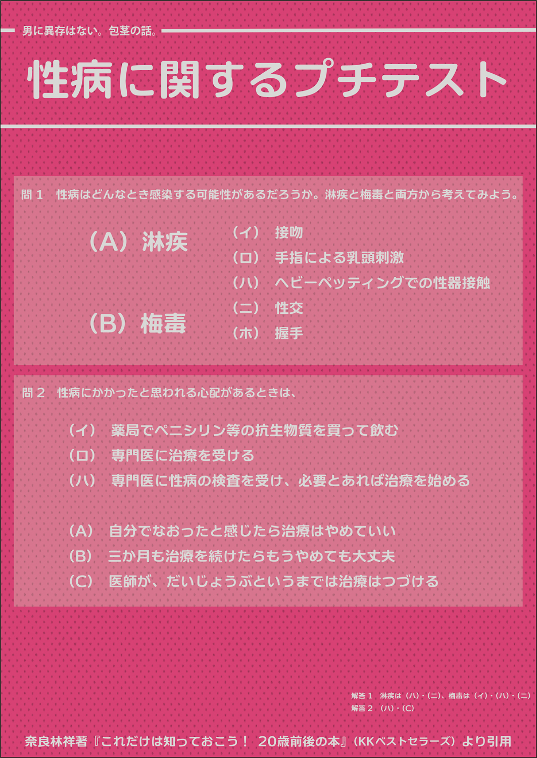 ○性感染症は自分で治せない。性器等に異変を感じたら、男性は泌尿器科、女性は産婦人科に相談をすること。