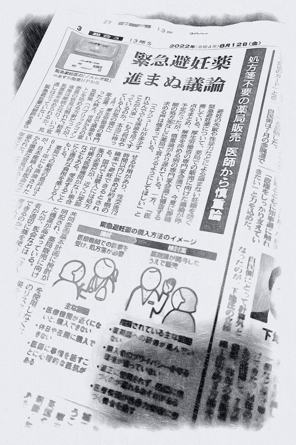 2022年8月12日付朝日新聞朝刊に、「緊急避妊薬進まぬ議論」「処方箋不要の薬局販売 医師から慎重論」という見出しの記事が掲載された。厚生労働省の専門家会議で、今夏中に課題点がまとめられ、個別の専門家会議で報告されるはずであったが、残念ながらそんな日程には至らなかった。