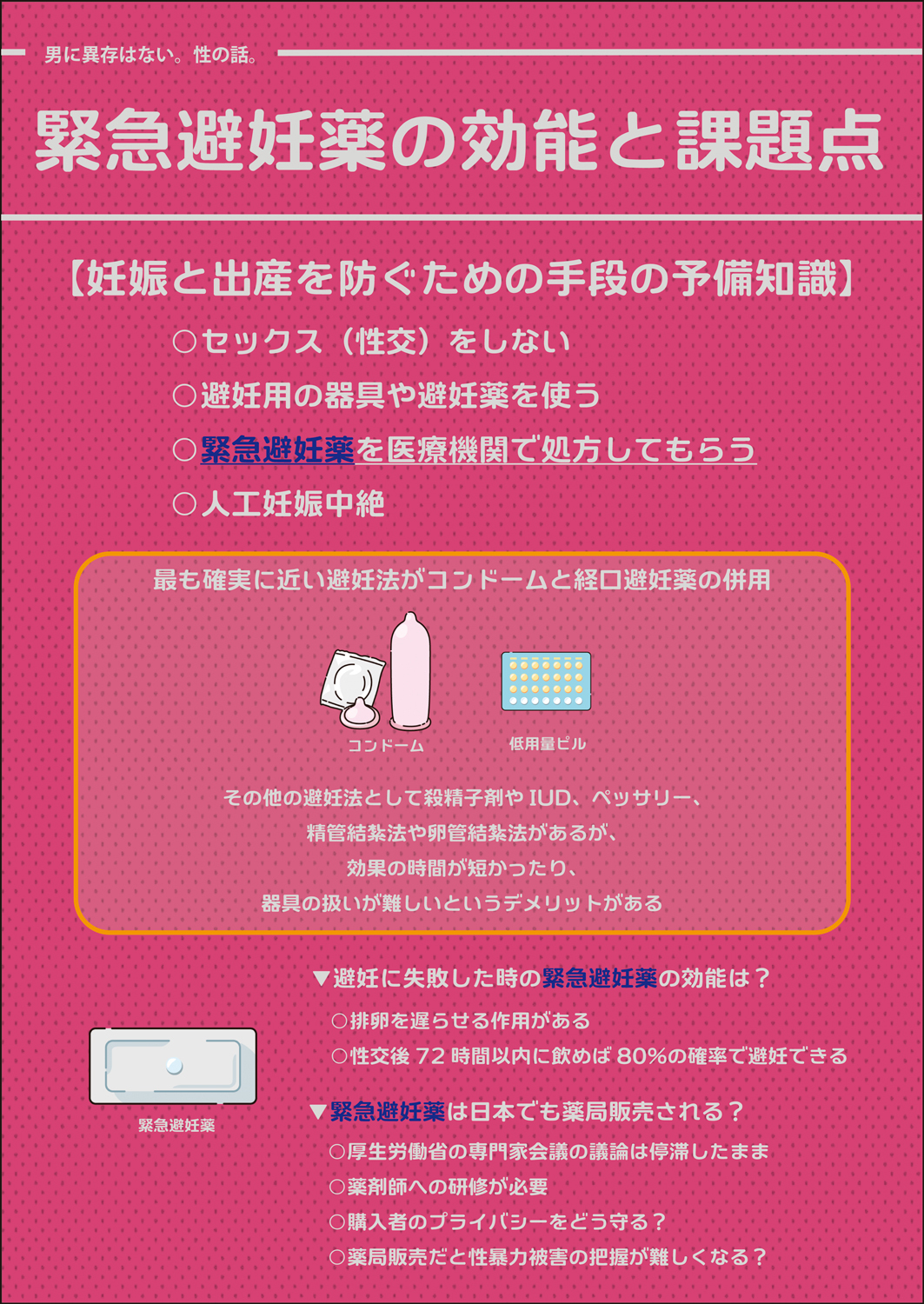 妊娠を回避する方法として、避妊法というのがある。この避妊の知識が十分ではなく、女性の経口避妊薬(低用量ピル)の利用があまり浸透していない側面もあり、コンドームに頼りがちだ。