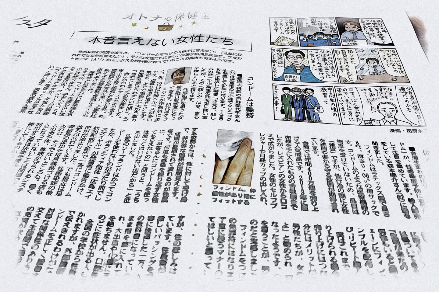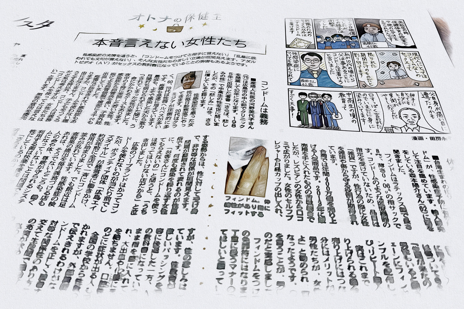 2022年10月12日付朝日新聞夕刊の「オトナの保健室」で、「本音言えない女性たち」という記事が掲載された。性感染症を患い、診察室に訪れる女性たちの本音として、コンドームをつけてと相手に言えなかったり、乱暴なセックスに我慢していたりという実情が少なくない。産婦人科医の河野美代子さんが、実際に毎日診察室に訪れる患者さんの女性たちの声を拾っている。