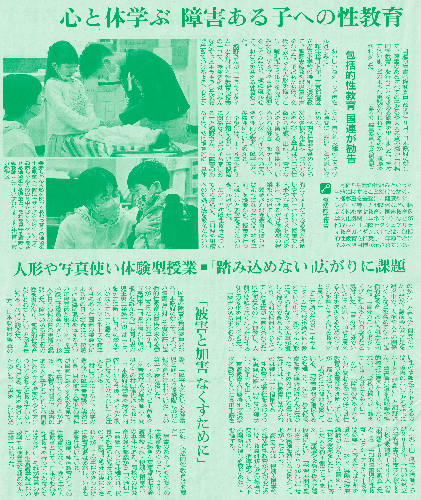 2023年2月12日付朝日新聞朝刊の記事「心と体学ぶ 障害ある子への性教育」(塩入彩、編集委員・大久保真紀)の中で、昨年12月上旬の、東京港区立赤羽小学校の特別支援学級における包括的セクシュアリティ教育の取り組みの様子がルポルタージュされていた。記事を要約する。