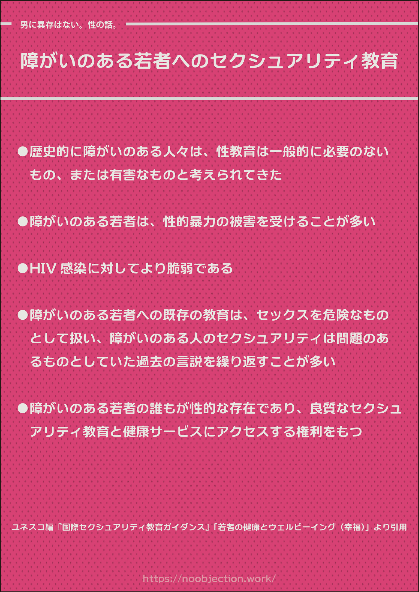 子どもたちに関する記述では、家庭やケア環境における障がいのある子どもたちに対する体罰や暴力が禁止されていないこと、また子どもたちを保護する対策が不十分であることが指摘されており、災害などの緊急事態時での障がいのある子どもたちに対する配慮、あるいは行政上のサービスが不十分であることなども挙げられている。つまり、障がいのある子どもたちへの性教育そのものを求める記述は、全体のうちの一つに過ぎないのだ。