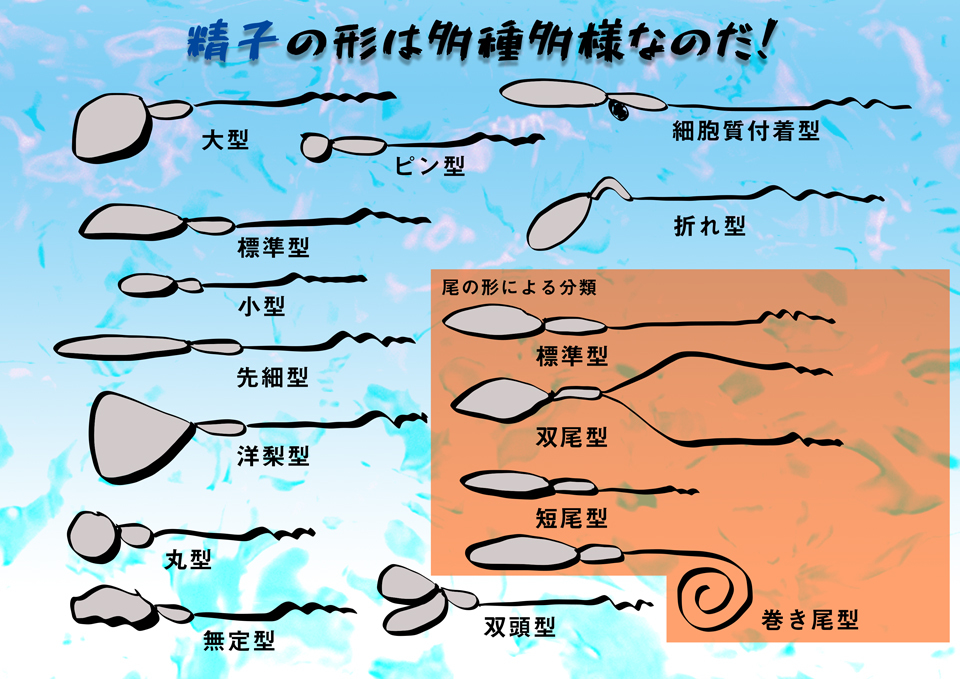《この精子のイメージはたいていの人がよく知っているのだが、実はそのような精子は、ふつう1回の射精で出る精子の中でも、わずか半分ちょっとしかいない。精子軍団はふつうに考えられているより、もっとずっと違った性質の精子がいる混成部隊なのである。その部隊には、大きい頭、小さい頭、ピンのようにとんがった頭を持つものもいる。ピン頭は、頭の部分がとても小さいのでDNAの遺伝子のパッケージを運ぶことができない。さらに、丸い頭もいれば、葉巻型、洋梨型、ダンベル型、またあまり不規則に変形しているので何と説明していいかわからない形をした頭の持ち主もいる。さらには頭が二つ、三つ、非常に稀には四つも頭を持つ精子もいるのだ。